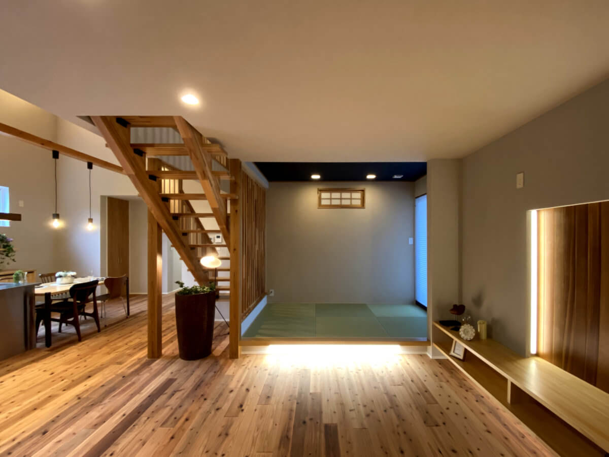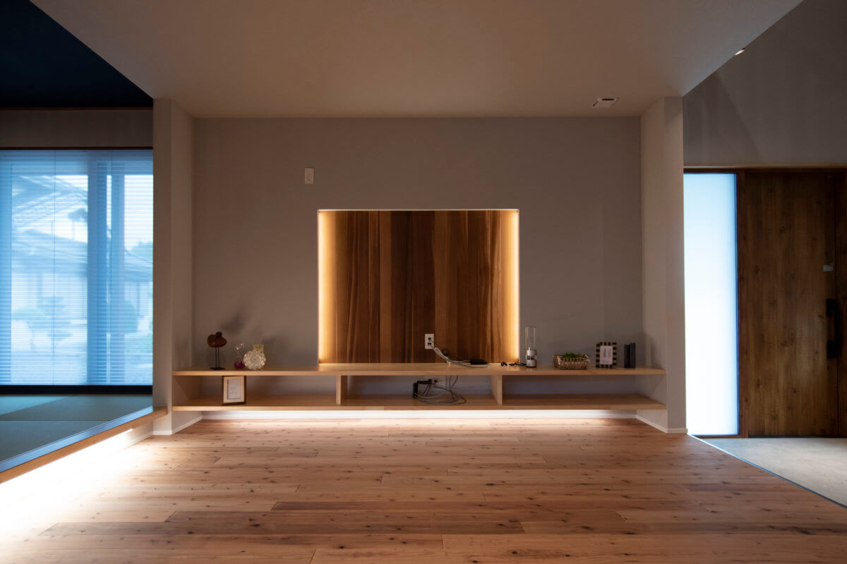 内装には手触り・足触りの良い杉材を贅沢に使い、リビングの一角にはくつろぎの小上がり畳スペースを配置。テレビ背面の羽目板と間接照明の演出が、木の温もりをより一層引き立てます。