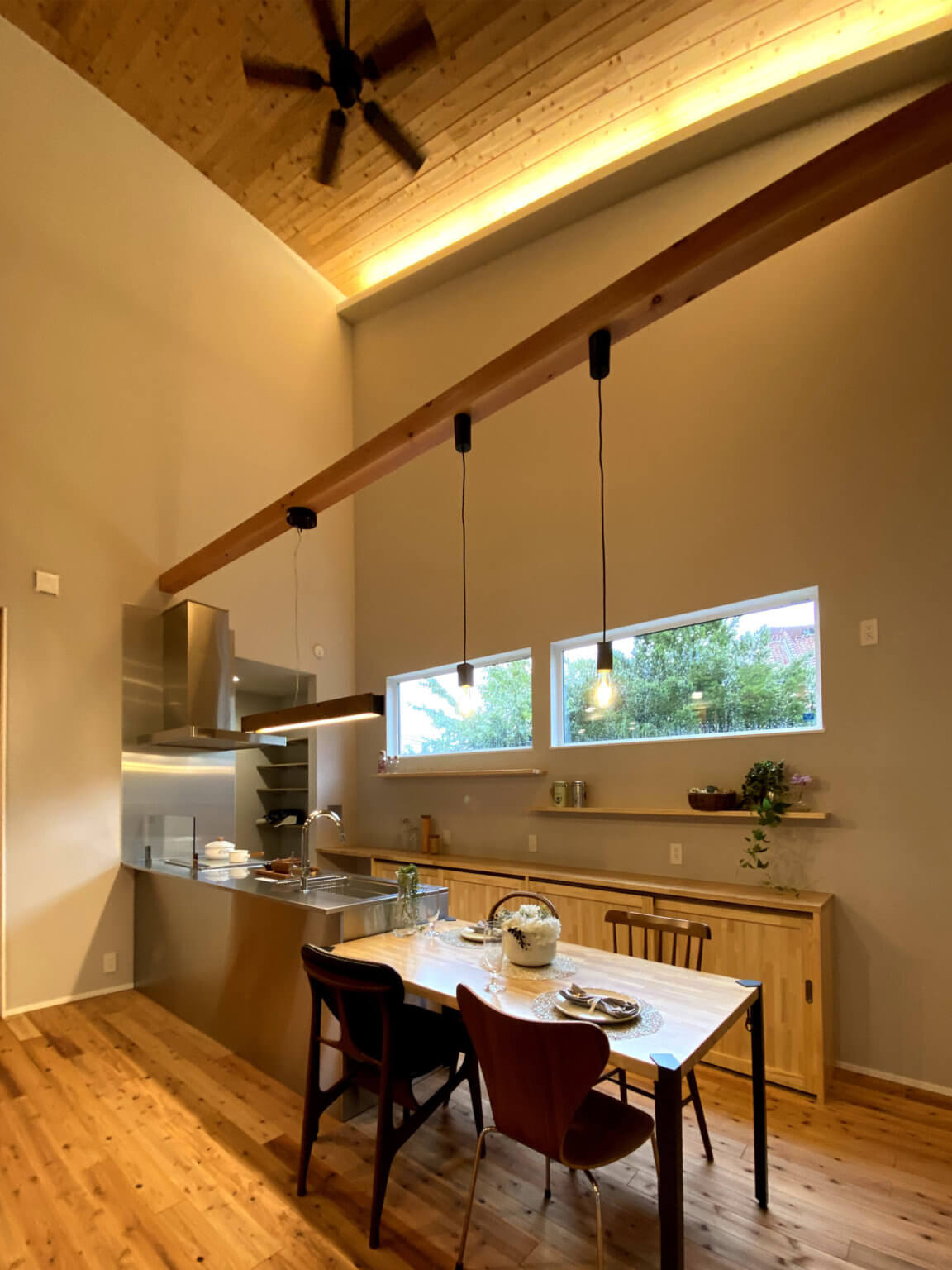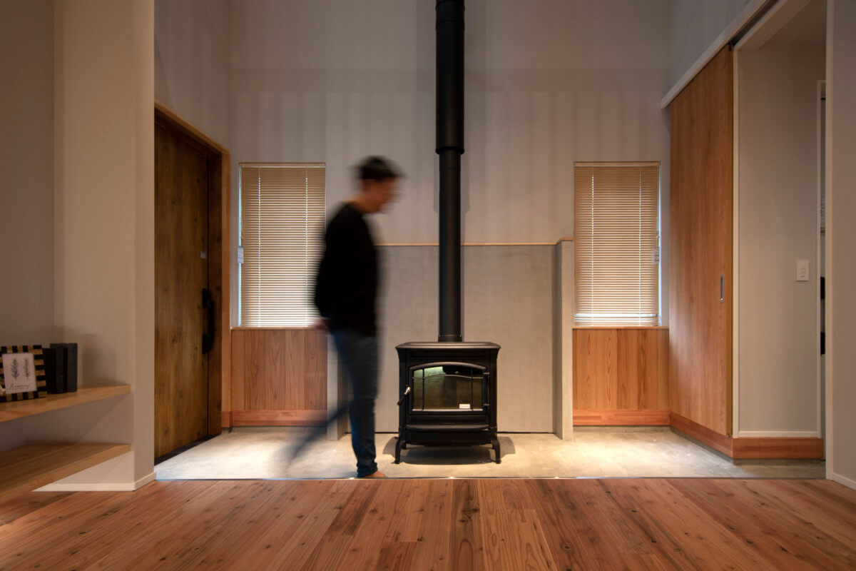 杉材の香りに包まれる、心安らぐ住まいが完成しました。一番の特徴は、ガレージから続く広々とした土間。リビング脇の土間には薪ストーブが鎮座し、揺らめく炎が家族を温かく迎えます。この暖かさは各部屋の「欄間」を通して家全体に行き渡るよう設計されています。