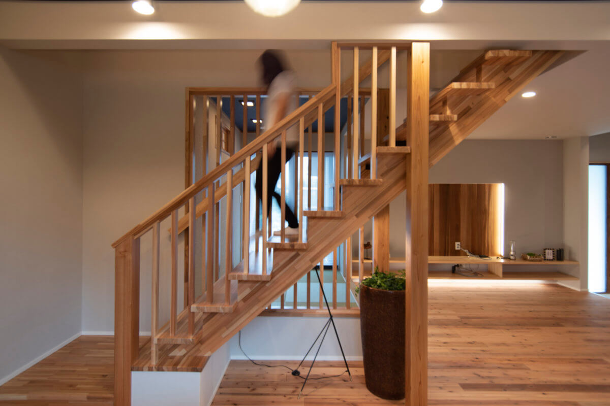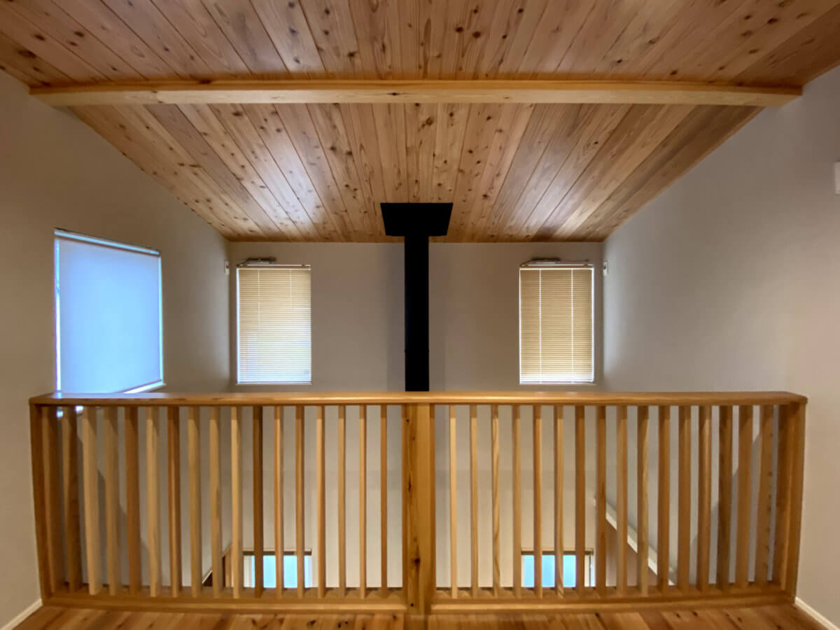 2階ホールには、意匠性の高い格子手摺を採用。光と風を通す格子が、明るく開放的な空間を創り出します。木材の香りと薪ストーブの温もり、そして職人技が光る格子の美しさが融合した、五感でリラックスできる木の家です。