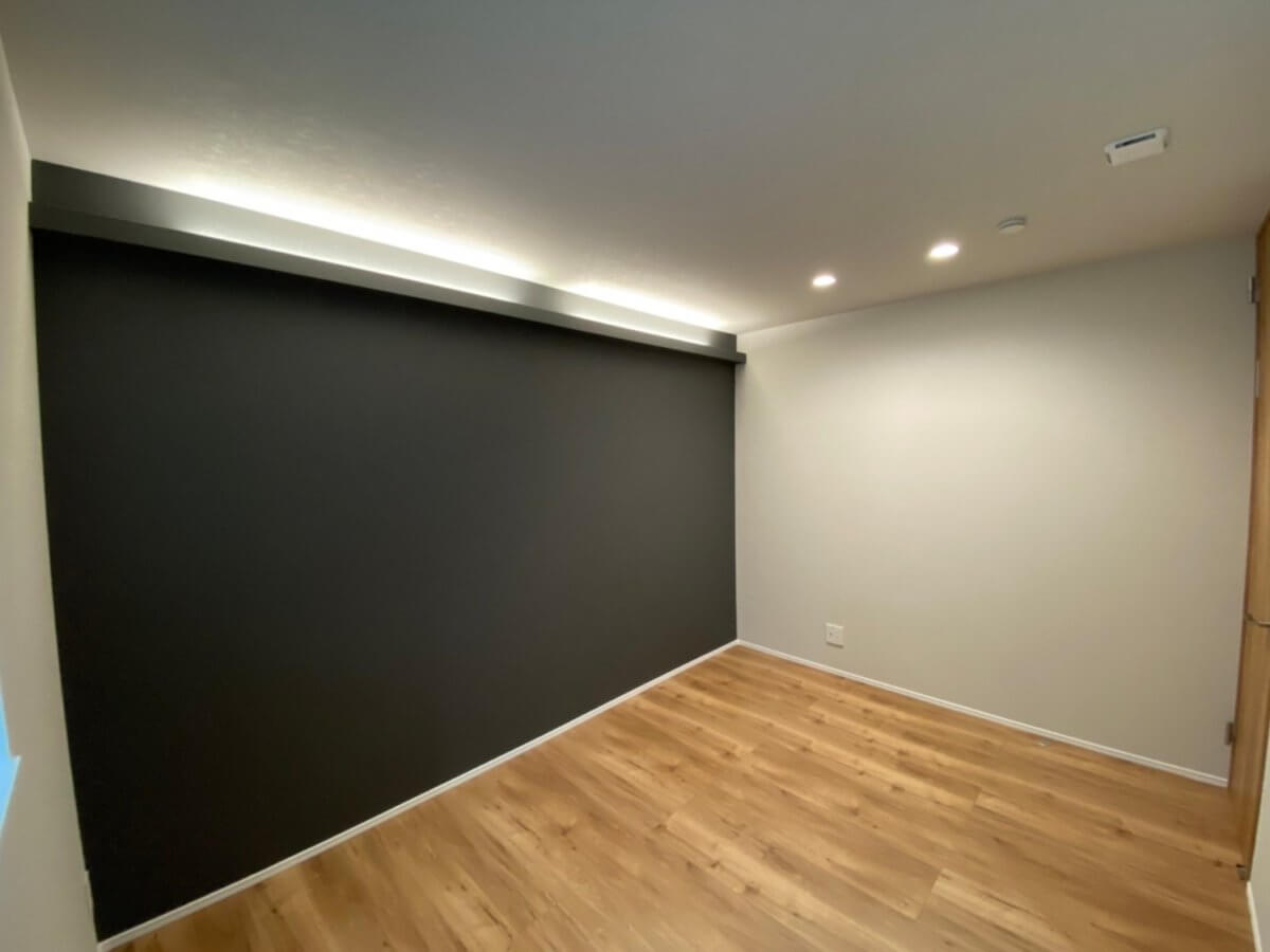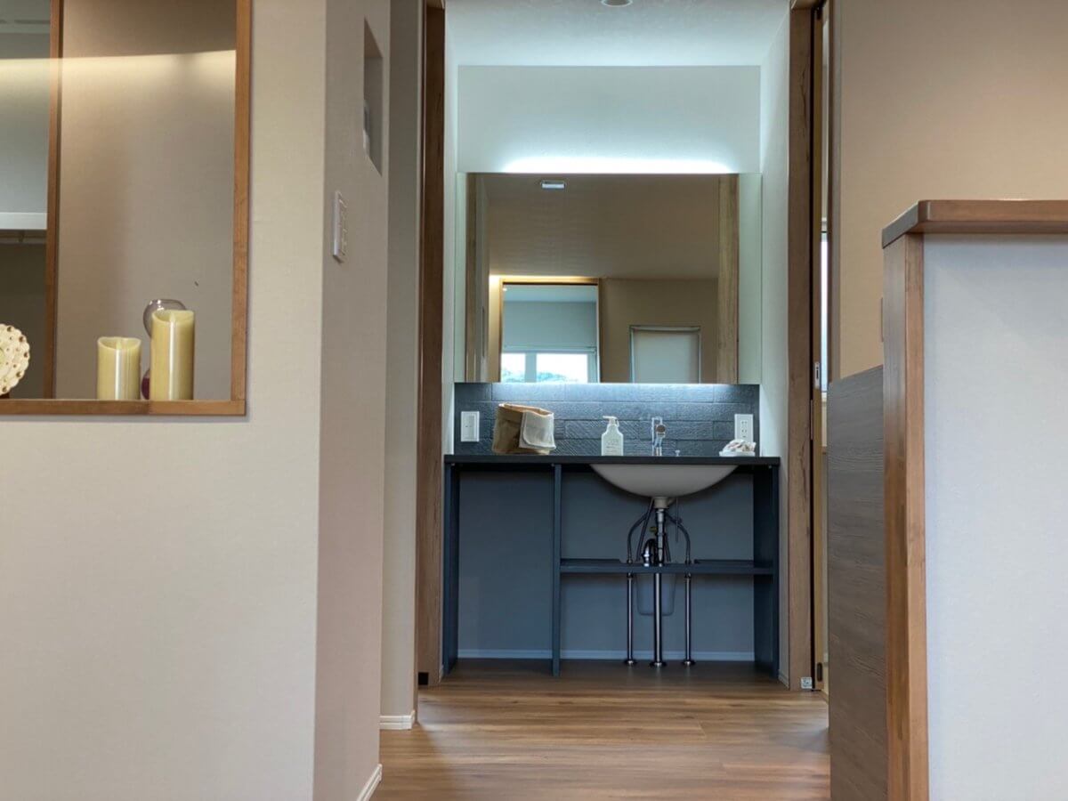 幅広のオリジナル洗面化粧台は、まるでオシャレなショップを訪れたような設えで、忙しい朝の身支度も心弾むひとときへと変えてくれます。また、広々とした子供室は、成長に合わせて将来的に2室へ区切ることが可能な可変性を持たせました。主寝室はシックな色合いで統一し、間接照明の柔らかな灯りに包まれる、くつろぎの空間に仕上げています。