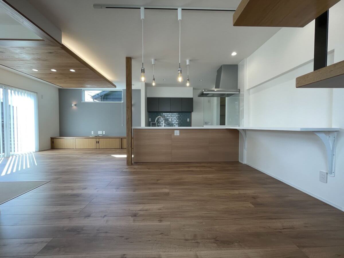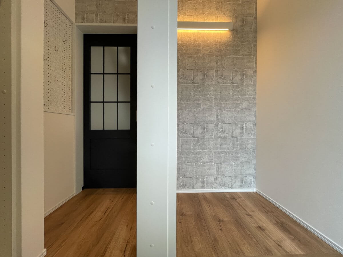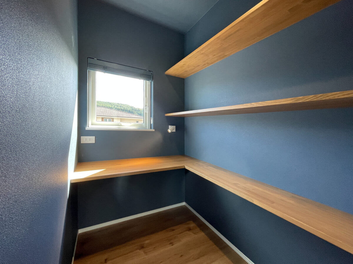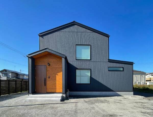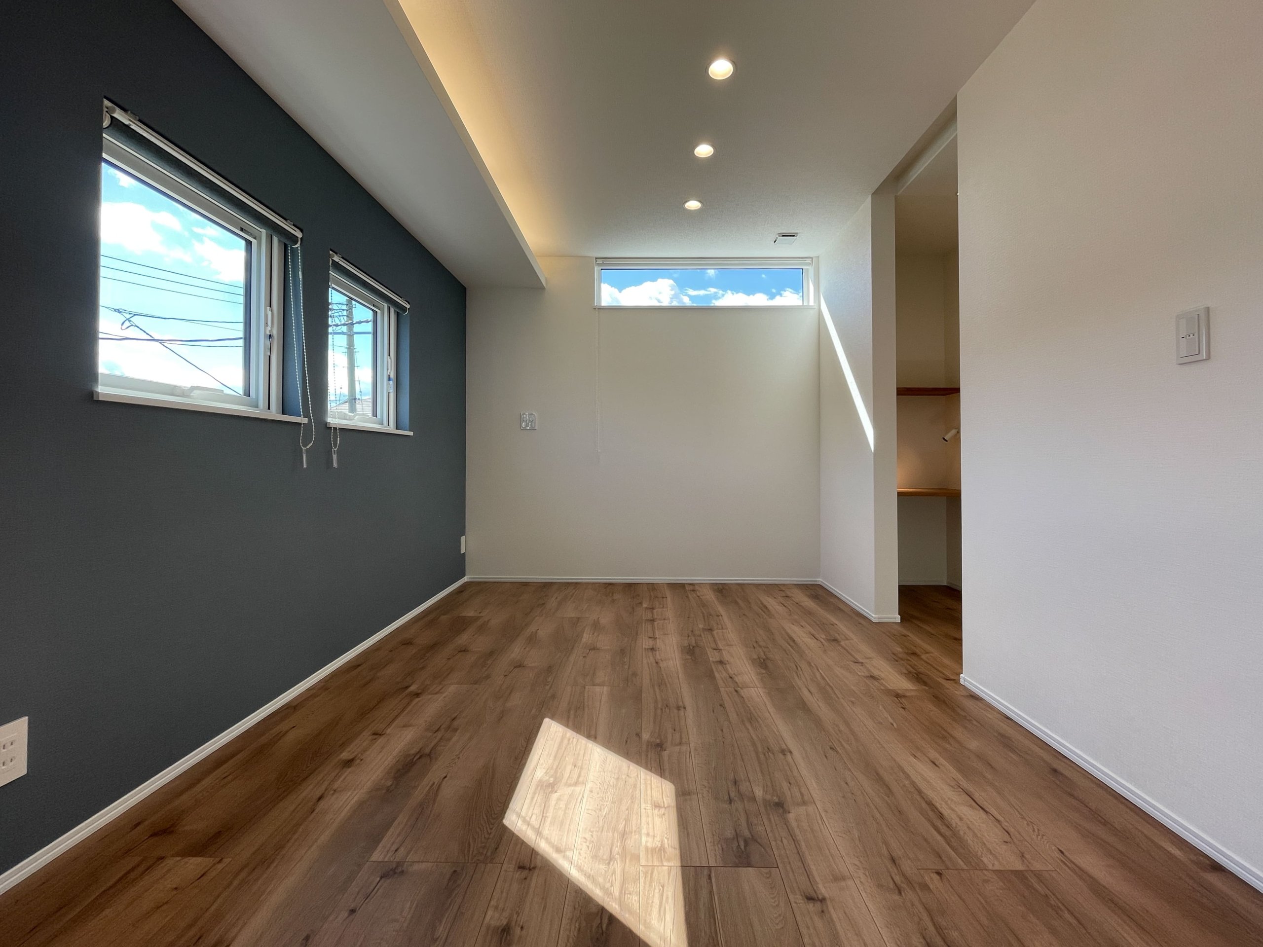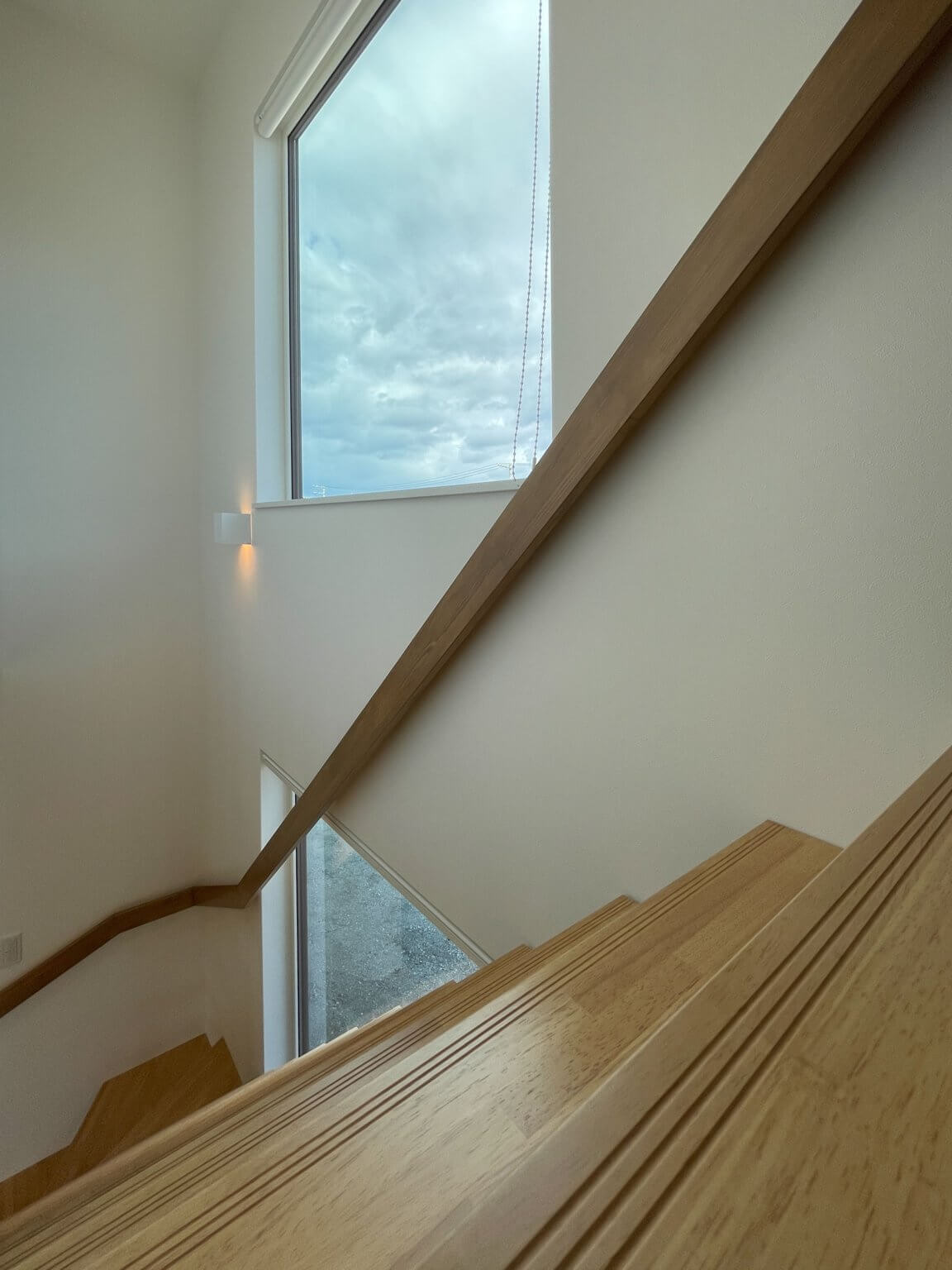 内装は、ラスティックな木質感に黒とグレーのアクセントを加えた、落ち着きのあるLDKが中心。玄関からリビングへ向かうと、フロストガラスをはめ込んだ紺色のアクセントドアが目を引きます。階段の大きな窓からは、移り変わる空模様と柔らかな光が差し込み、家全体を明るく演出。寝室の高窓は、清々しい朝日を室内に取り込んでくれます。