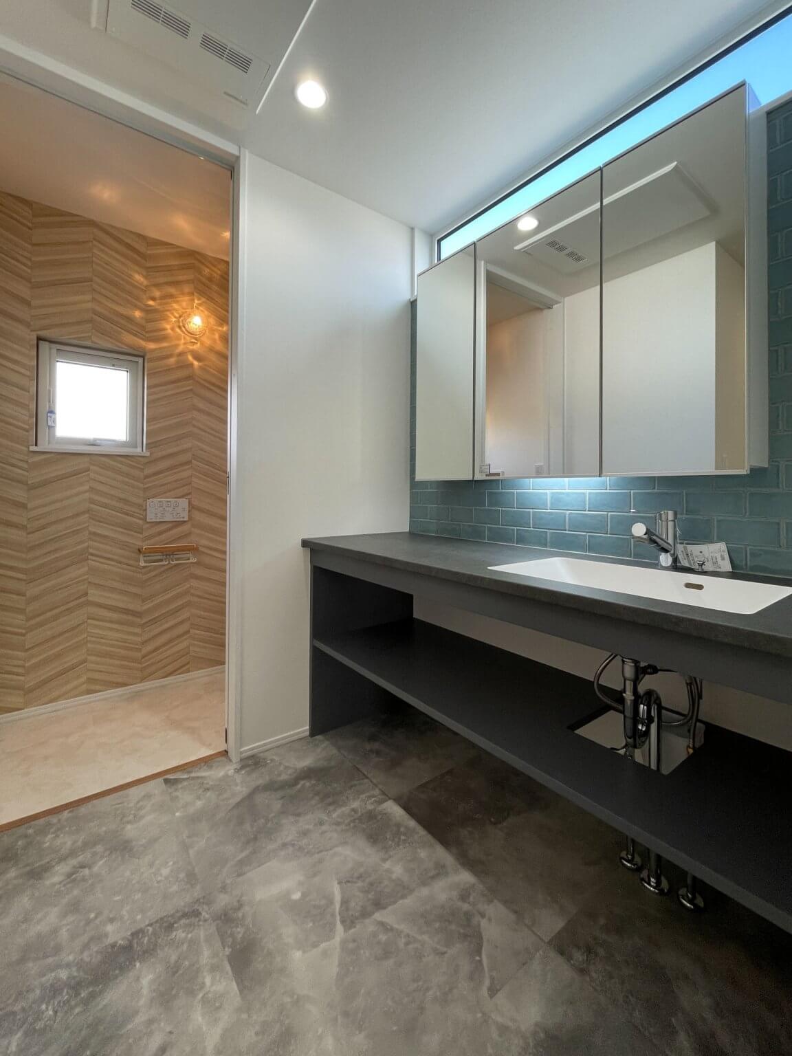 細部にもこだわり、洗面台にはサブウェイタイルと石を用いて質感豊かに仕上げました。寝室脇のデスクスペースや、大容量の収納を備えたシックなワークスペースなど、日々の使い勝手にも妥協しない、美しさと強さを兼ね備えた一邸です。