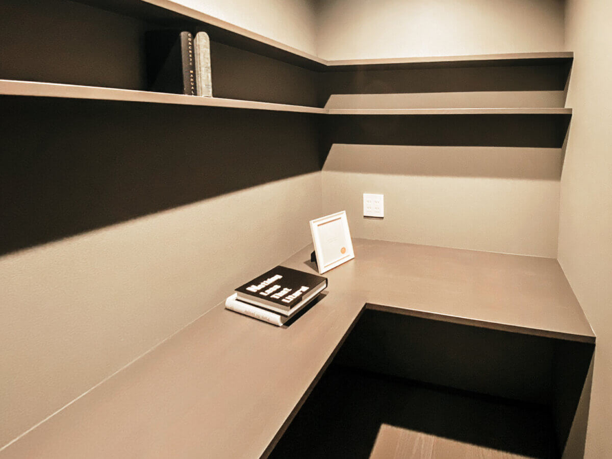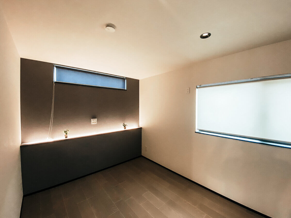 ご主人の趣味スペースは、お手持ちの本が美しく収まるように設計。寝室もブラック×ホワイトで統一し、日常を忘れさせるホテルライクな空間に仕上げています。カラーコーディネートと空間構成を突き詰め、家族が心から寛げる洗練された一邸です。