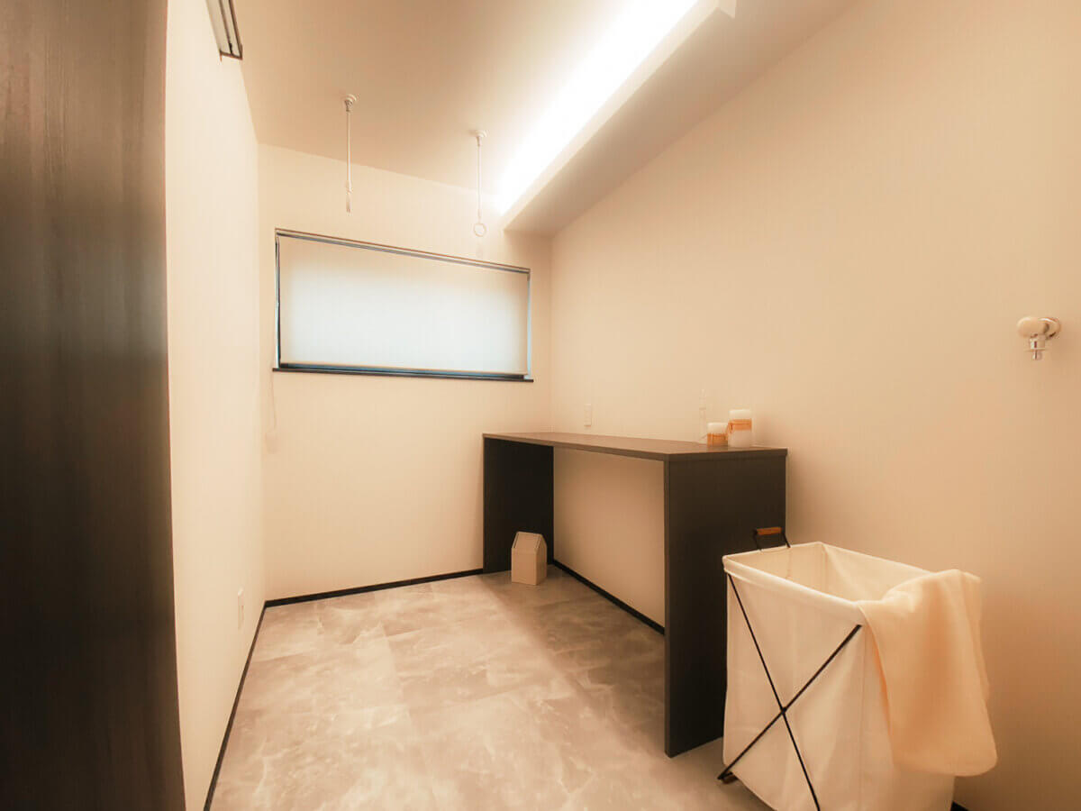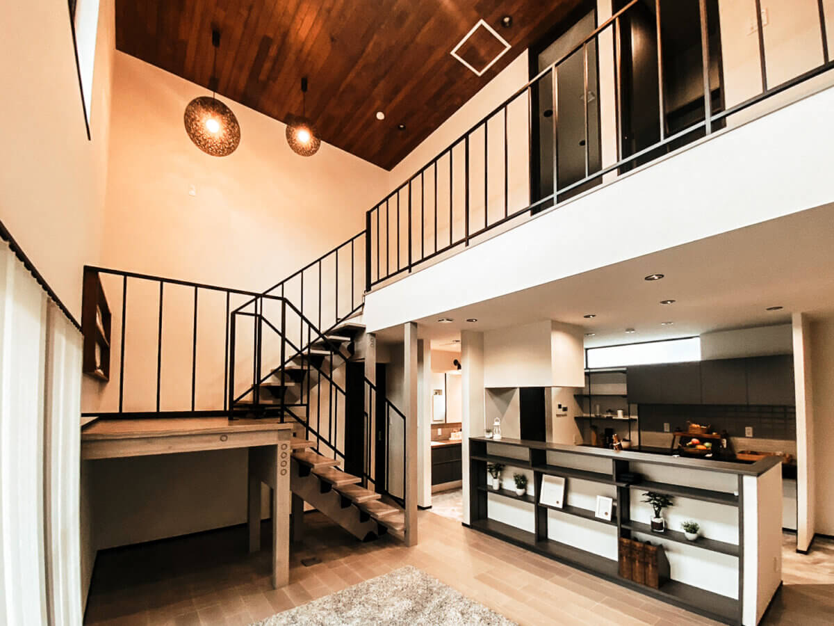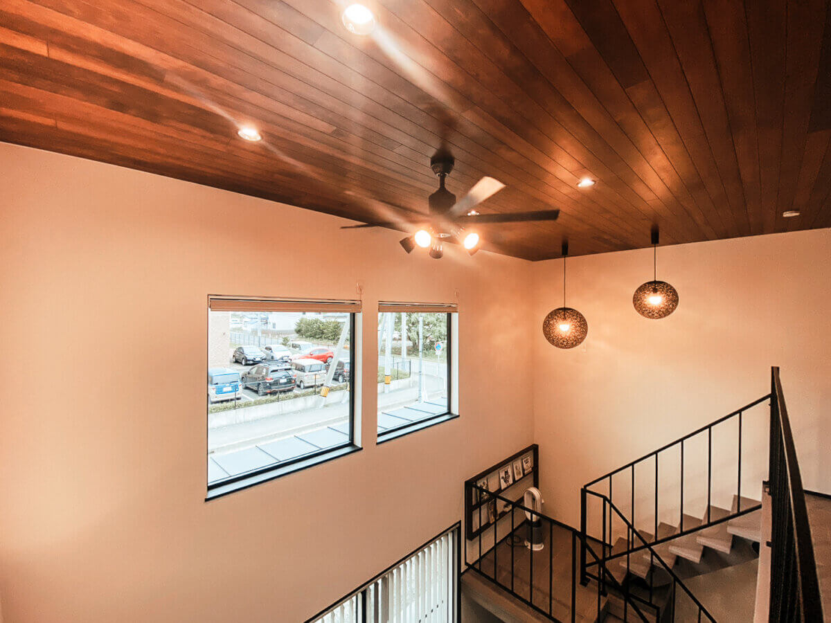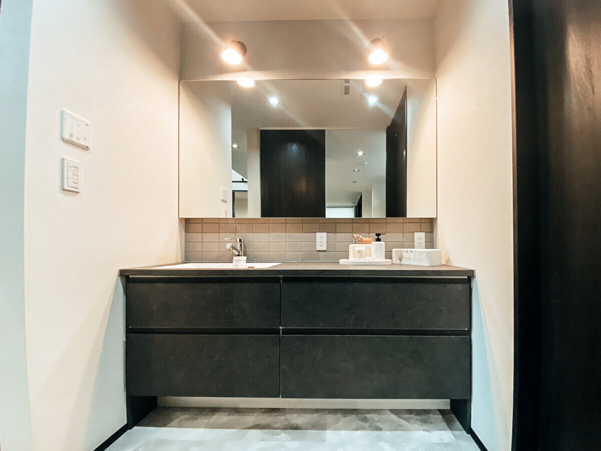一番の見どころは、大きな吹き抜けとスキップフロアが織りなすダイナミックなリビング空間。視線が縦横に抜ける開放的な設計に加え、天井にあしらわれた圧巻の板張りが、空間に上質な温もりを添えています。洗面台はブラックストーン調で仕上げた完全オリジナル。ランドリールームもトーンを合わせ、家事の時間さえも贅沢に感じられる設えにしました。
