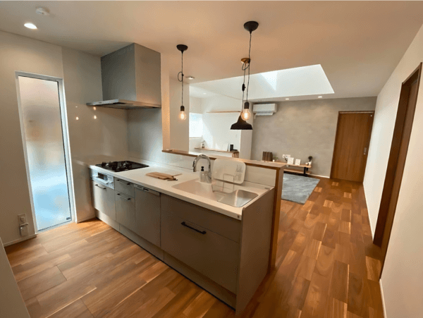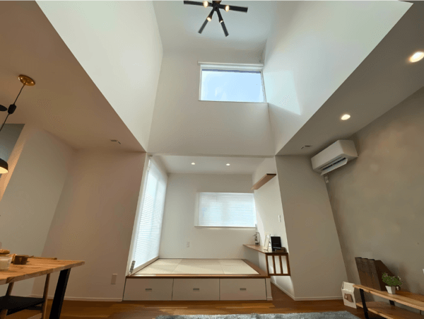 内装の主役は、床のアカシア材と美しく調和するモルタル風のキッチン。木材の自然な質感にグレーのアクセントを加えることで、スタイリッシュながらも落ち着きと温かみを感じる空間に仕上げました。リビングには大きな吹き抜けとタタミコーナーを設け、家族がフレキシブルに集える開放的な場所を創出しています。