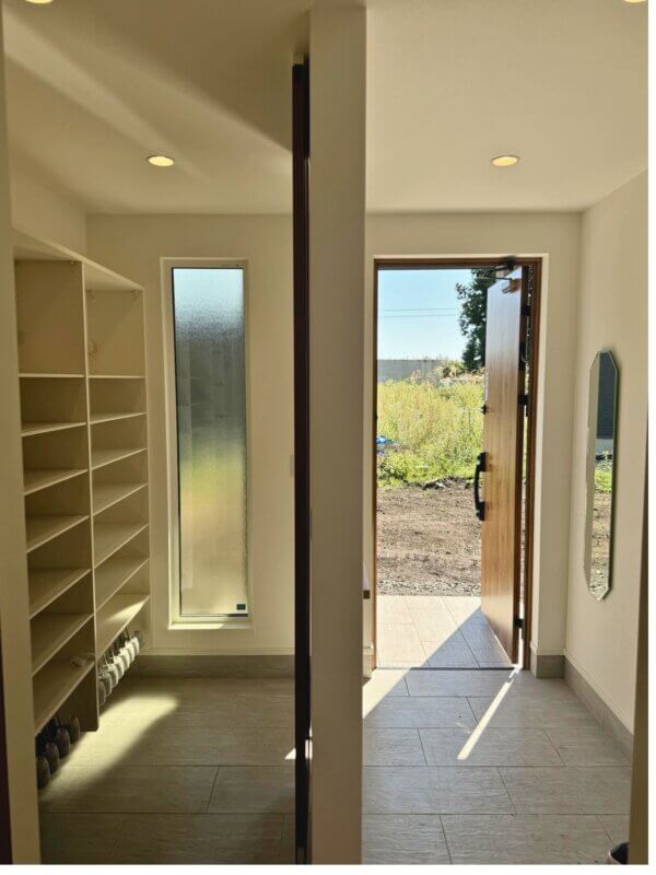 中心となるのは、優しい木漏れ日が差し込む20帖の広々としたLDK。その一角には3帖のタタミコーナーを併設しました。大工の手による造作で、お子様の勉強に最適なカウンターデスクと、空間を有効活用した引き出し収納を設けています。また、玄関脇にはベビーカーやアウトドア用品も丸ごと収まる大容量のシューズクロークを設置。玄関周りを常に美しく保てる、人気の高い間取りを採用しました。