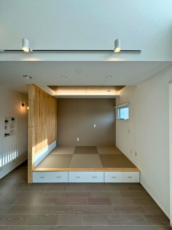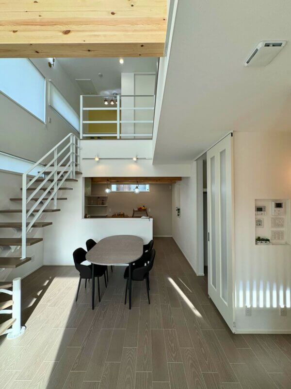 空間の主役は、リビングダイニングに配置した階段と大きな吹き抜け。上下階の視線が抜けることで、実際の面積以上の開放感を生み出しています。また、タタミコーナーに配された大工造作の格子は、直線的でリズム感のあるデザインが美しく、空間に落ち着きと安心感をもたらします。