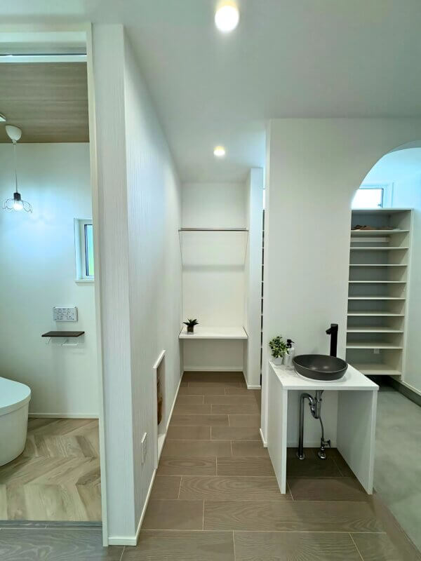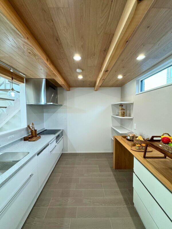 機能面では、昨今のニーズに応えて玄関に手洗いを設置。帰宅後すぐに汚れを落とせる、衛生的で便利な動線を実現しました。キッチンは、ダウンライトで天井面をすっきり見せつつ、カウンターにペンダントライトを配して手元の作業性を向上。デザインの美しさと、毎日の使い勝手を高い次元で両立させた、優しさあふれる一邸です。