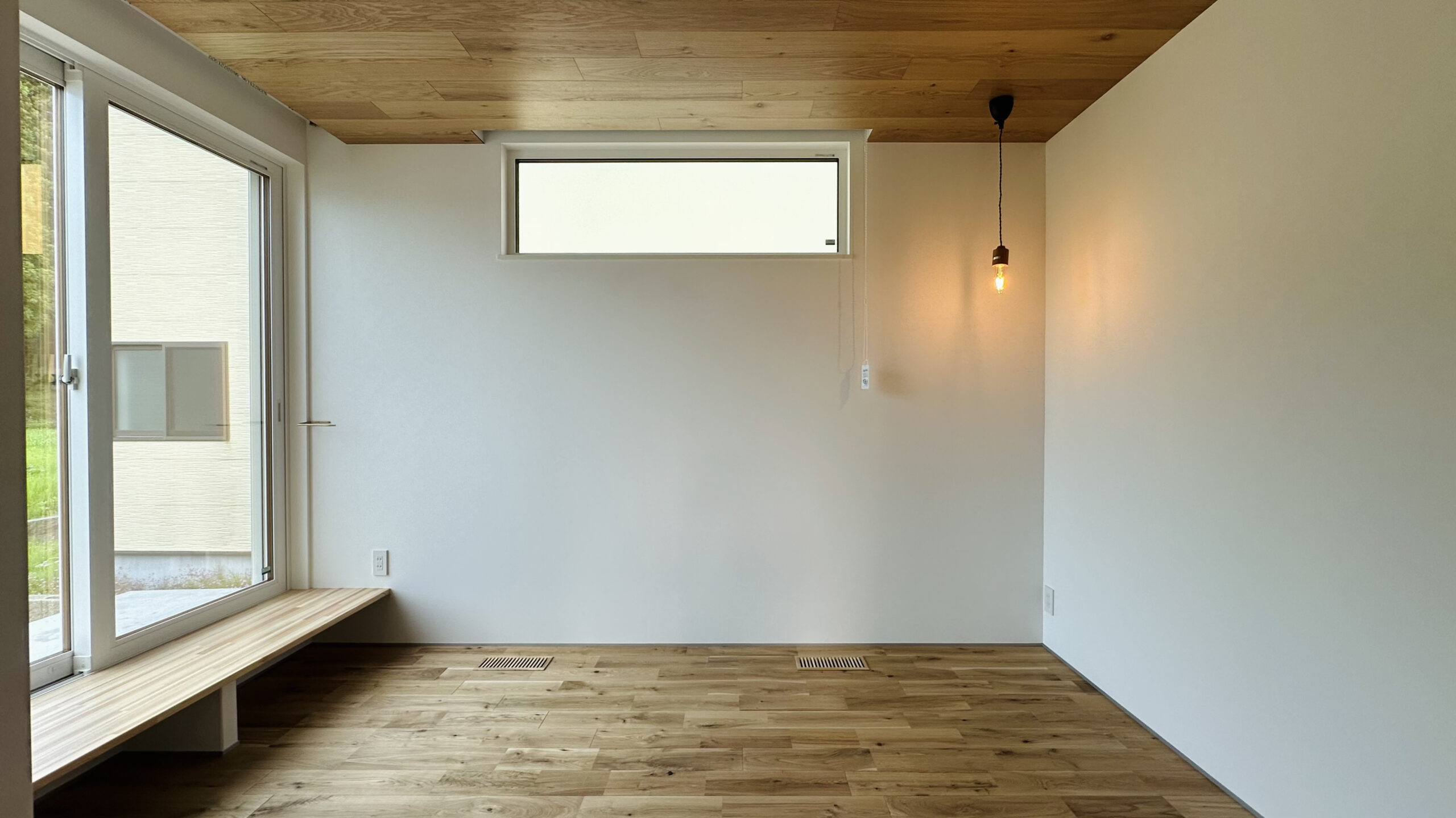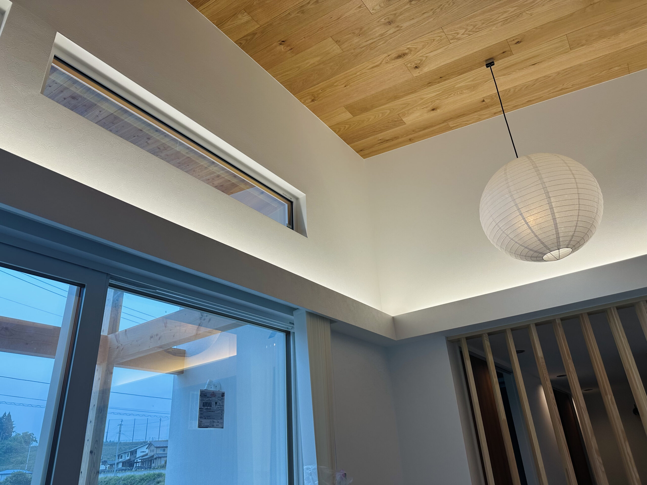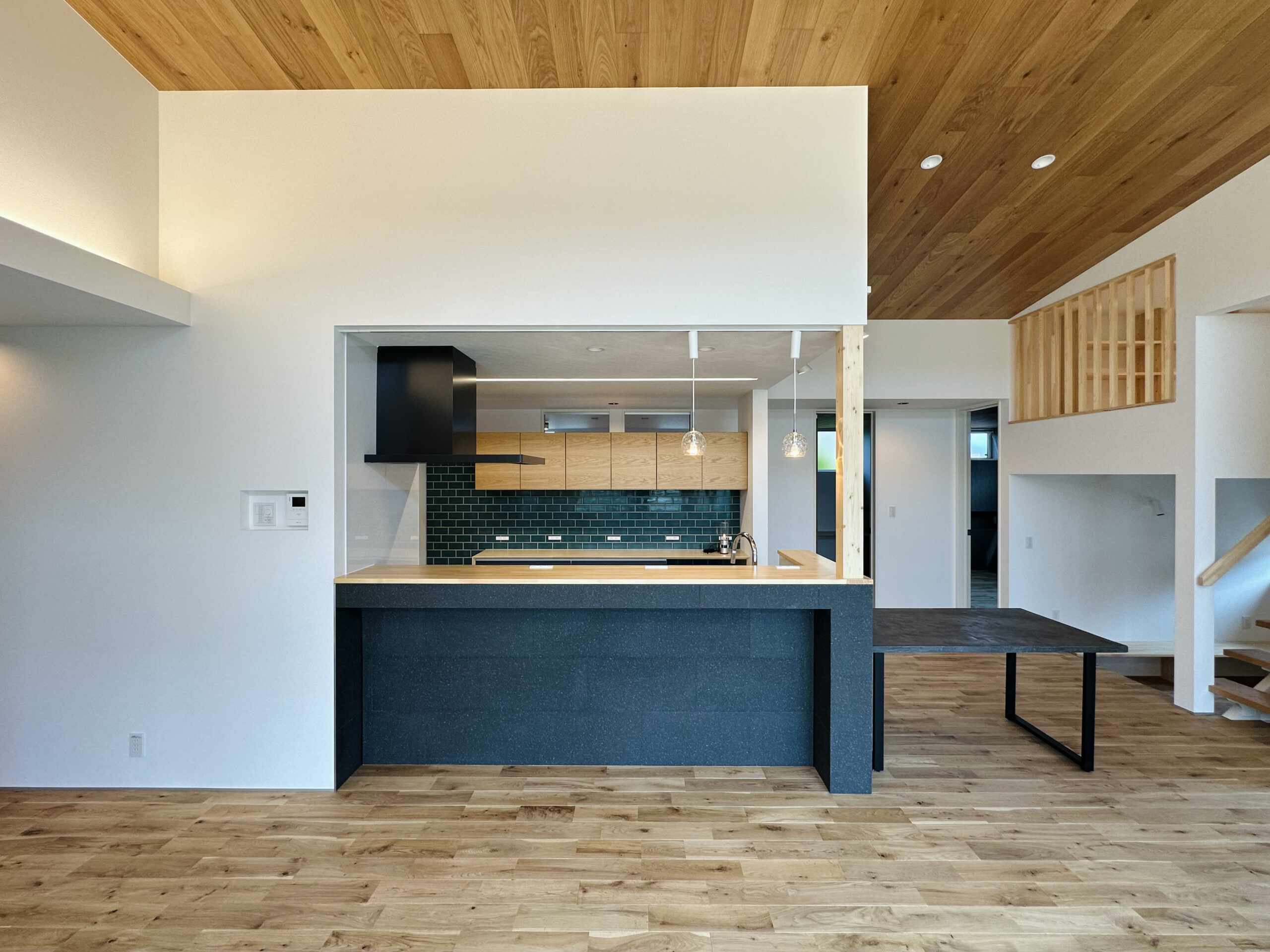 勾配天井のリビングは、光と視線が伸びやかに広がる開放的な空間。素材の表情や陰影が引き立ち、時間帯によって異なる表情を楽しめるのも魅力です。塗り壁と屋久島杉を組み合わせた外観は、自然素材ならではの風合いが美しく、落ち着きのある佇まいを演出しています。
