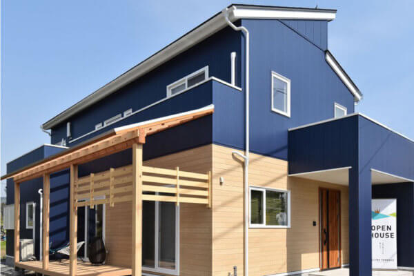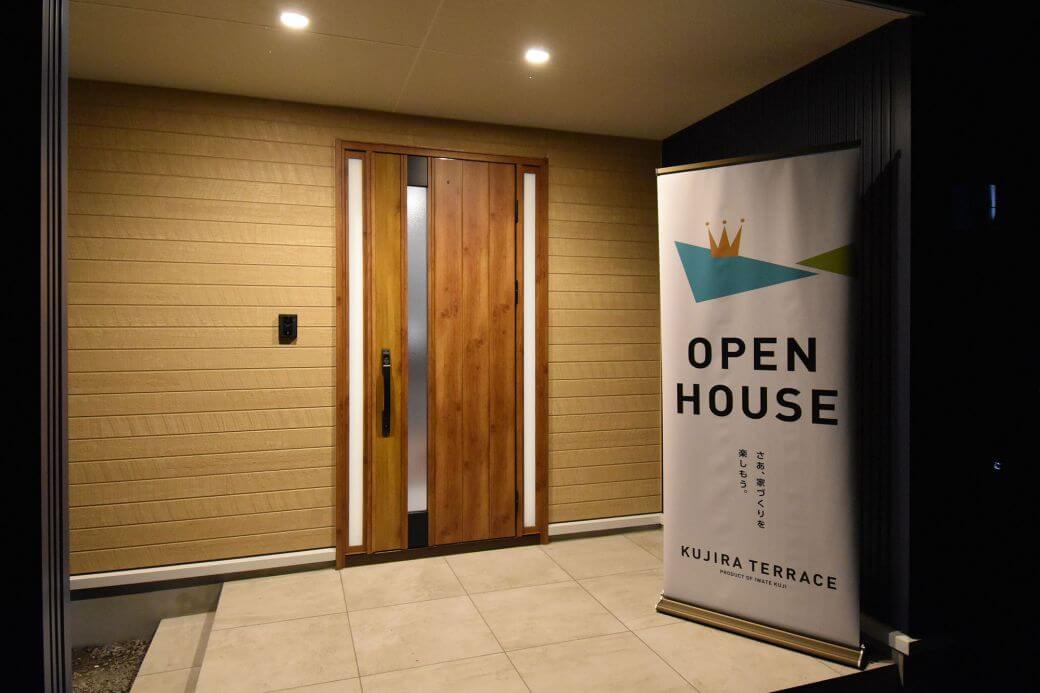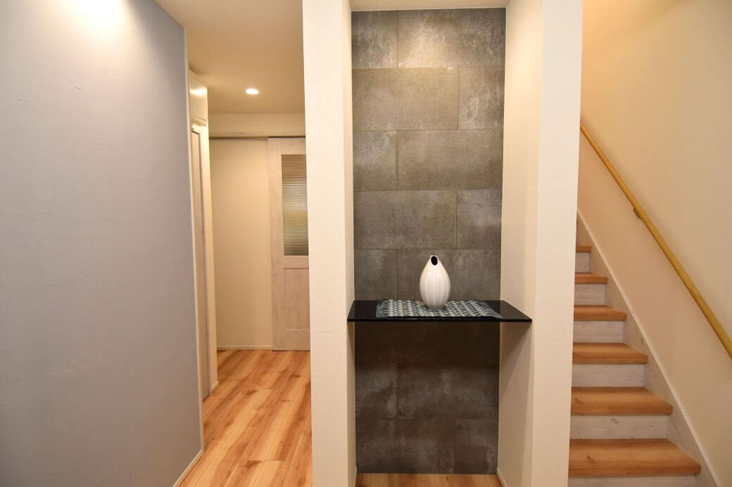 漆喰の壁や60cm角のタイル、そして天井一面に張られた総無垢材など、隅々まで選び抜いた素材が息づくK様邸。玄関ではスポットライトが無垢の扉を照らし、グレーの漆喰が上質な空間を演出します。