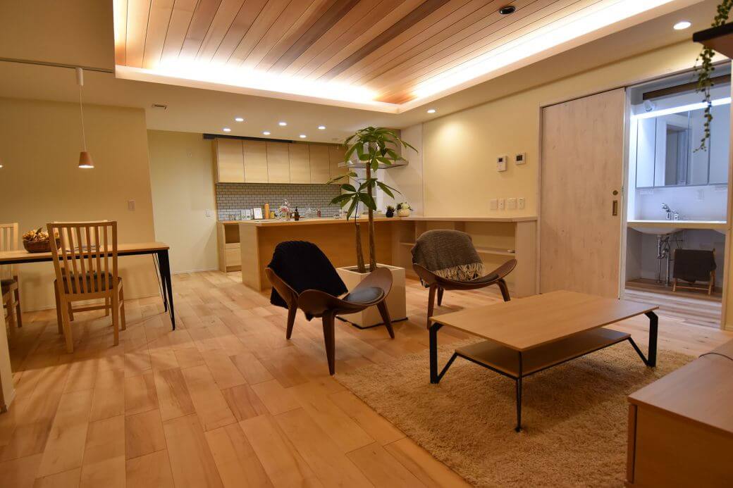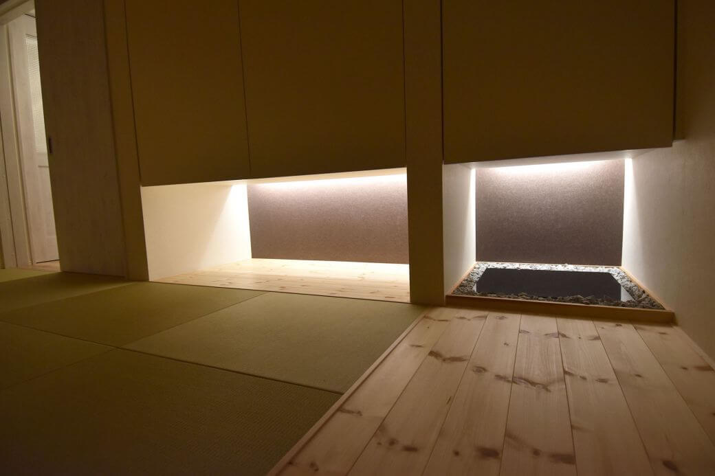 メインリビングと2階のセカンドリビングは、共に無垢の天井に間接照明を埋め込み、木の温もりと柔らかな光に包まれる設計。和室にもオーダーメイドの照明を取り入れ、豊かな表情を生み出しています。