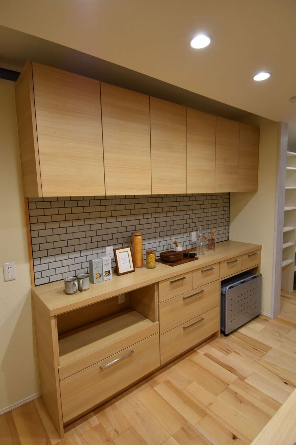キッチンはリビング全体を見渡せる開放的なレイアウト。ウッド調の収納やパントリーなど、家事動線を徹底的に追求しました。屋根付きのバルコニーでは、差し込む光を感じながらゆったりとした時間を愉しめます。施主様のこだわりと、きめ細やかな設計が融合した至高の住まいです。